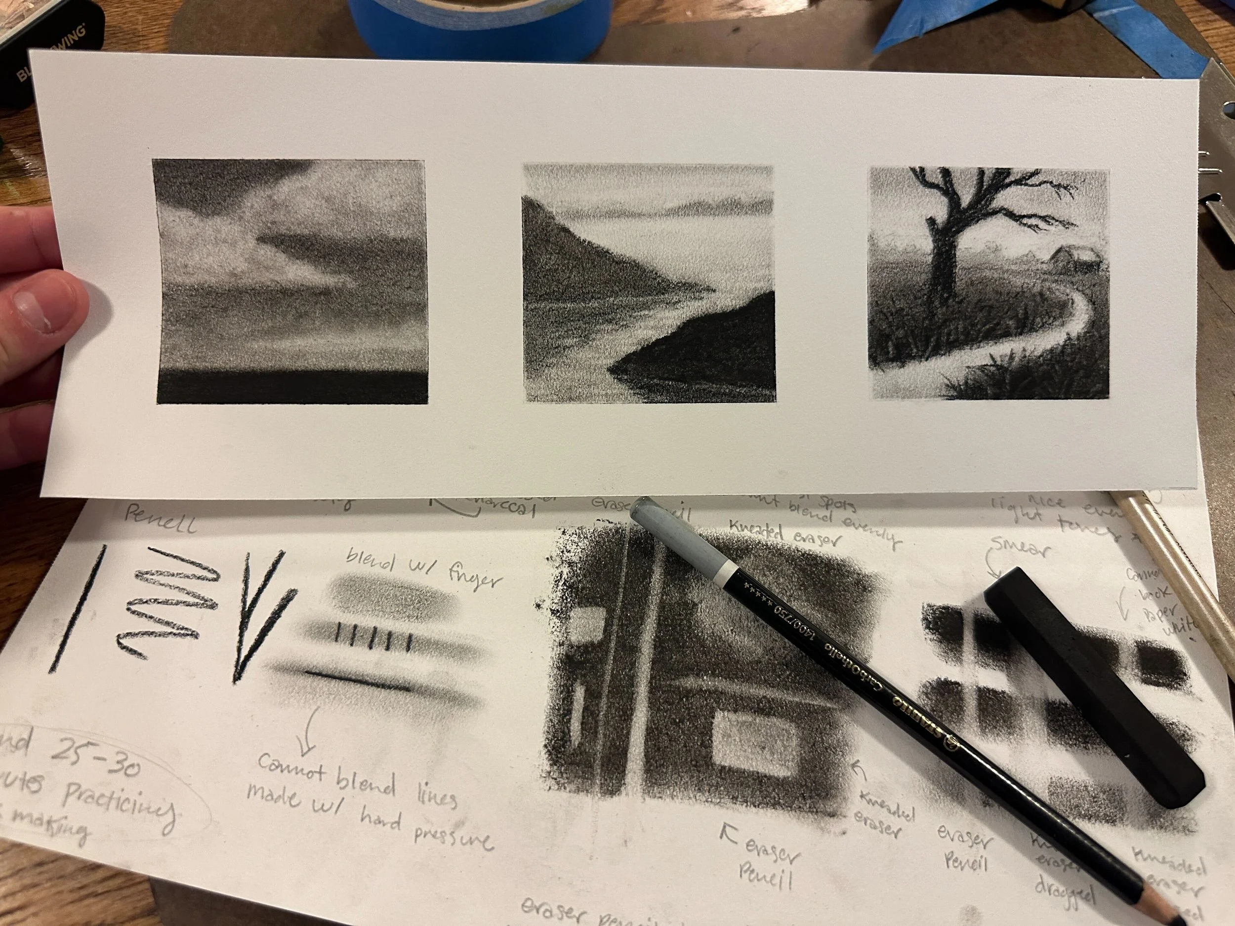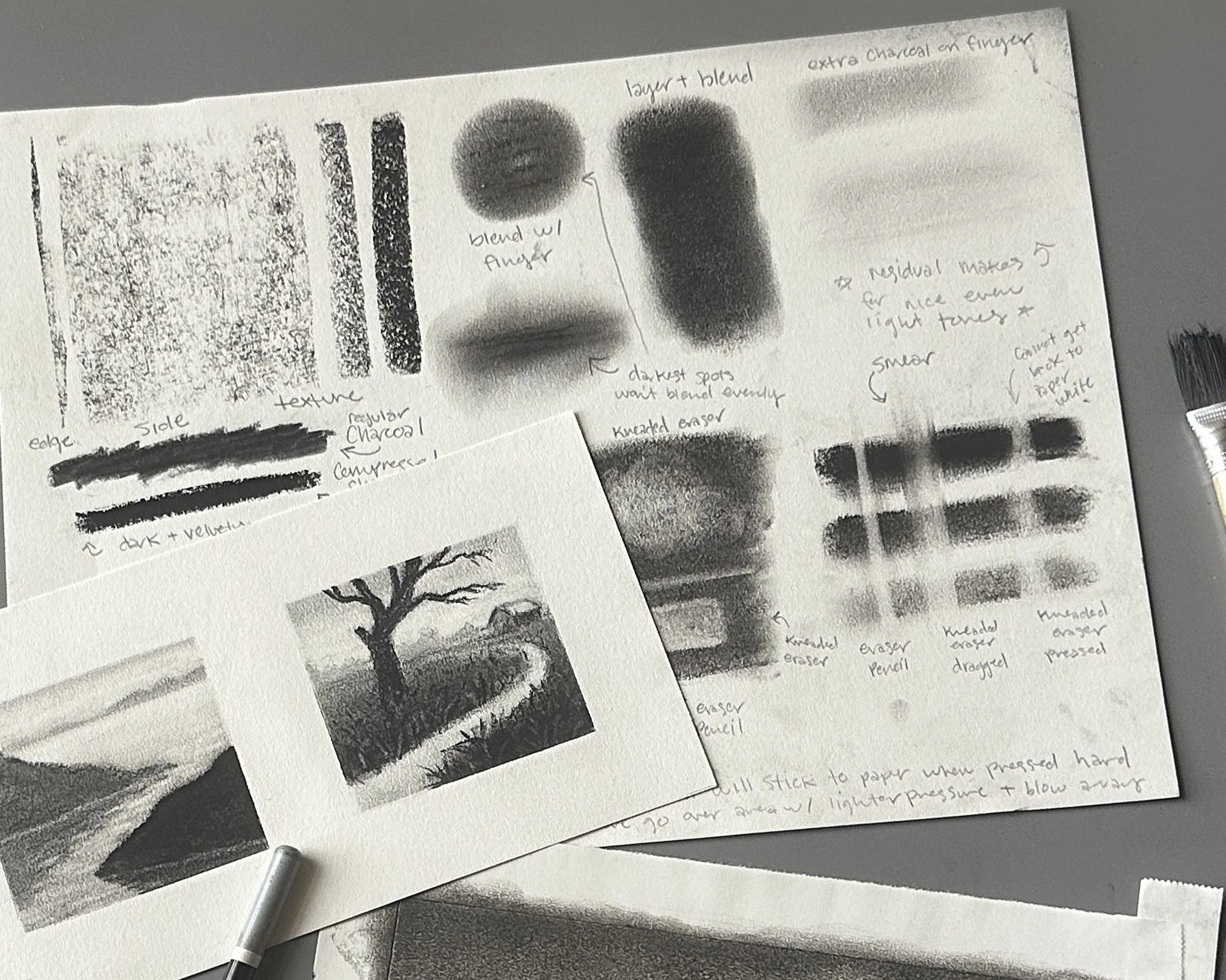 Explore the velvety blacks and soft greys of charcoal as you learn to bring landscapes to life. This beginner-friendly class will guide you step-by-step through the essentials of drawing natural scenes, from building depth and atmosphere to mastering value and tone. You’ll experiment with different erasers and blending techniques, create a series of mini practice landscapes, and then design your own final piece inspired by the world around you.