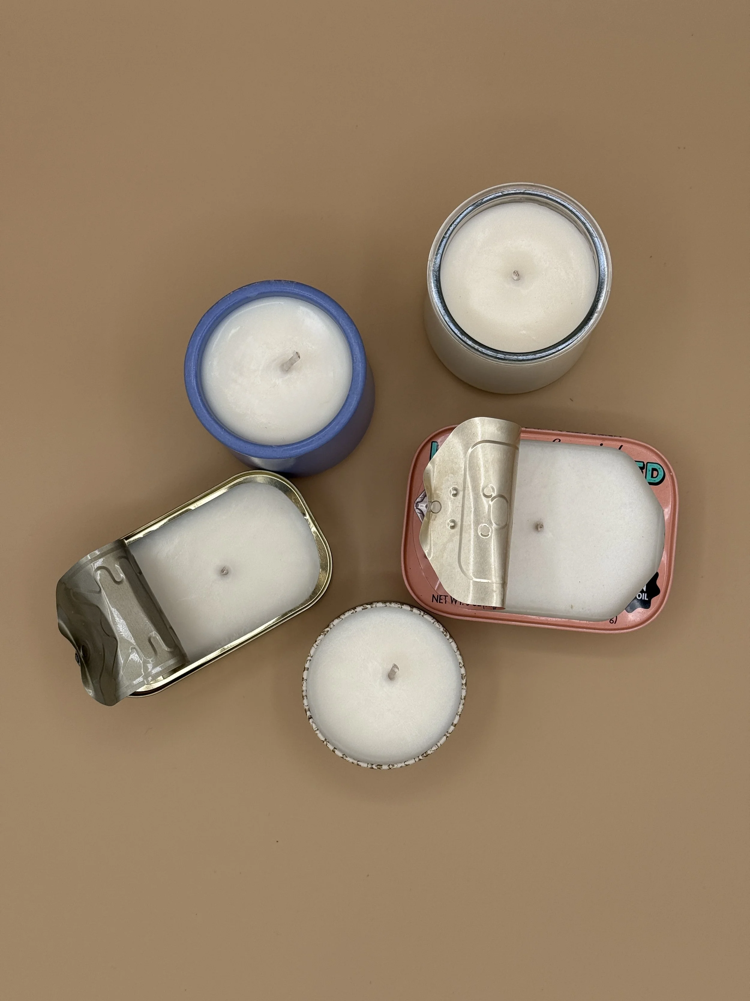Metal tins are great. Upcycled fish tins or other small metal containers make charming and safe candle vessels, as long as they’re cleaned thoroughly and free of sharp edges or coatings that could burn.