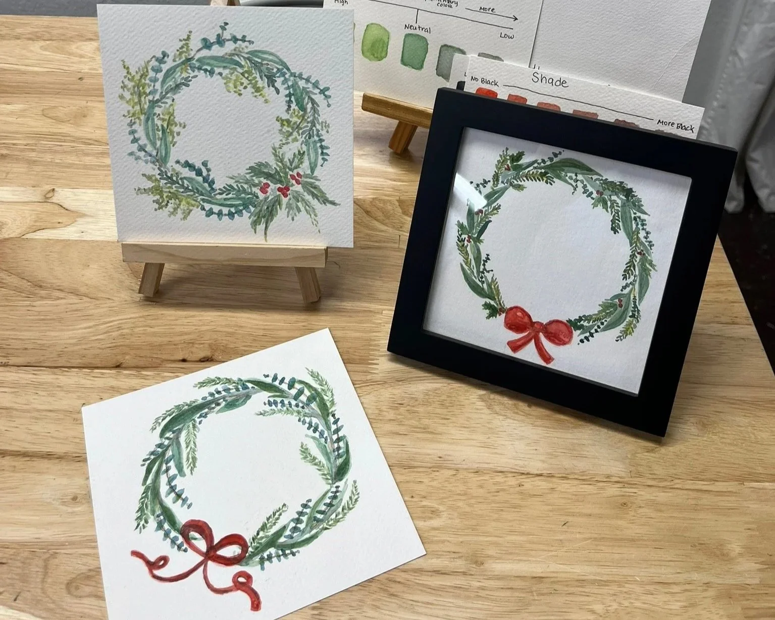 Each student will leave with their finished wreath masterpiece, a watercolor palette of 7 student-grade paints, 2 watercolor brushes, an extra sheet of watercolor paper, and 2 watercolor cards — everything you need to keep painting at home.You’ll walk away with the skills and confidence to recreate watercolor wreaths all holiday season!